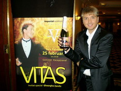 A legendary Maestro Gheorghe ZAMFIR was on the stage "Sala Palatului" in Bucharest to congratulate Vitas with his success. Mr Gheorghe ZAMFIR is a virtuoso who has four platinum discs and he has become a cult musician in Europe. He was surprised by the Artist's talent and prepared a special musical present, a composition devoted to the singer. During the press-conference in the presence of mass media from 12 European countries Mr ZAMFIR said his brilliant artistic talent and voice exceeding the legendary Farinelli had ensured Vitas "the sold out" all over the Europe. And producer Sergey Pudovkin got a surprise - a collection champagne with the name VITAS. The level of the interest to a legendary vocalist was so high in Europe, that the solo concert was shot by the First national TV channel with the following broadcasting all over the European channels. Spoilt by various shows Europe welcomed Vitas and applauded him.